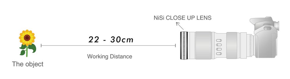 The best working distance: 22-30cm. We recommend using the close-up lens on telephoto lenses with an aperture of f/8-f/16 to achieve the sharped details.NiSi's Close-up lens is made of double optical corrective glasses with apochromatic design and muti-nano coating to give advanced resolution and natural color with almost no purple/green fringing both within focus and in bokeh.The NiSi Close Up Lens Kit NC 77mm II (with 67 and 72mm adaptors) includes: