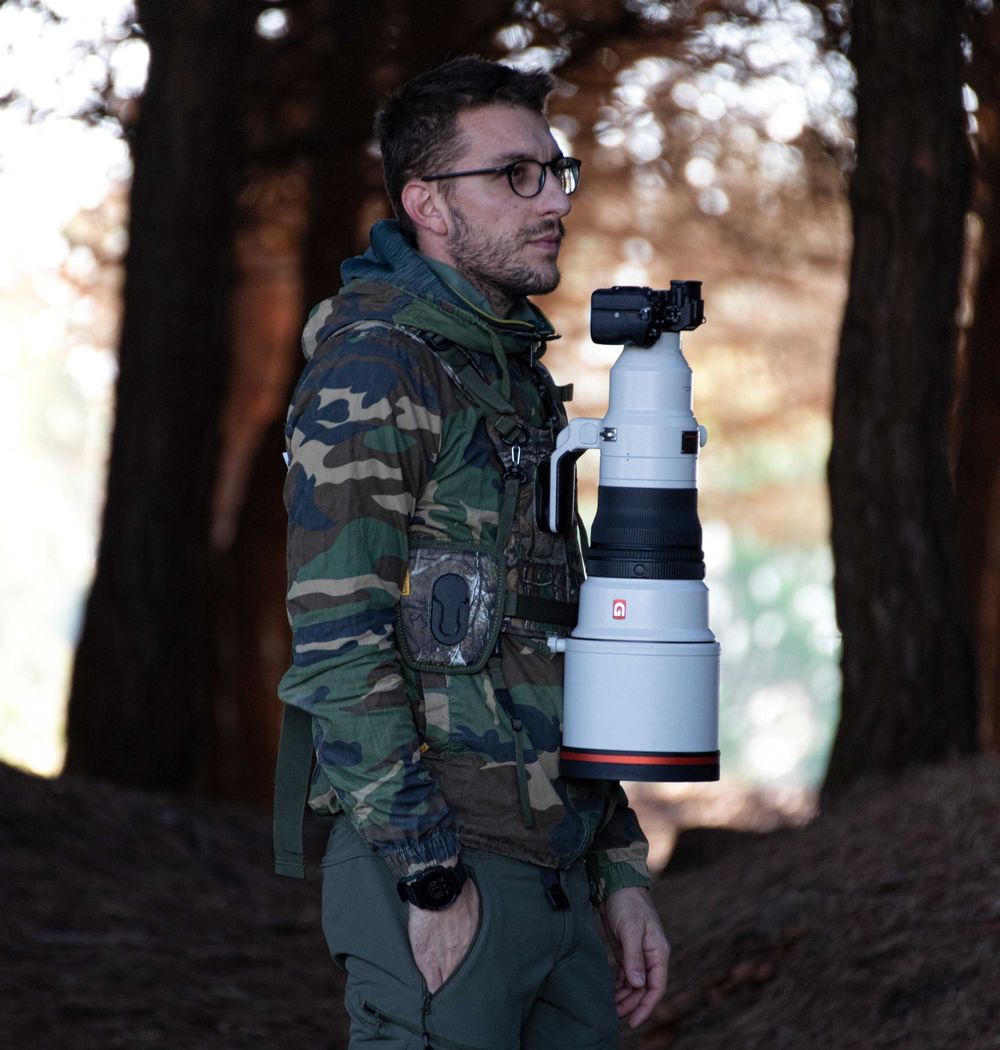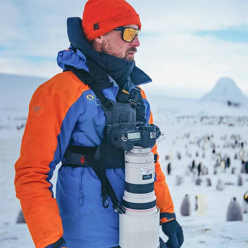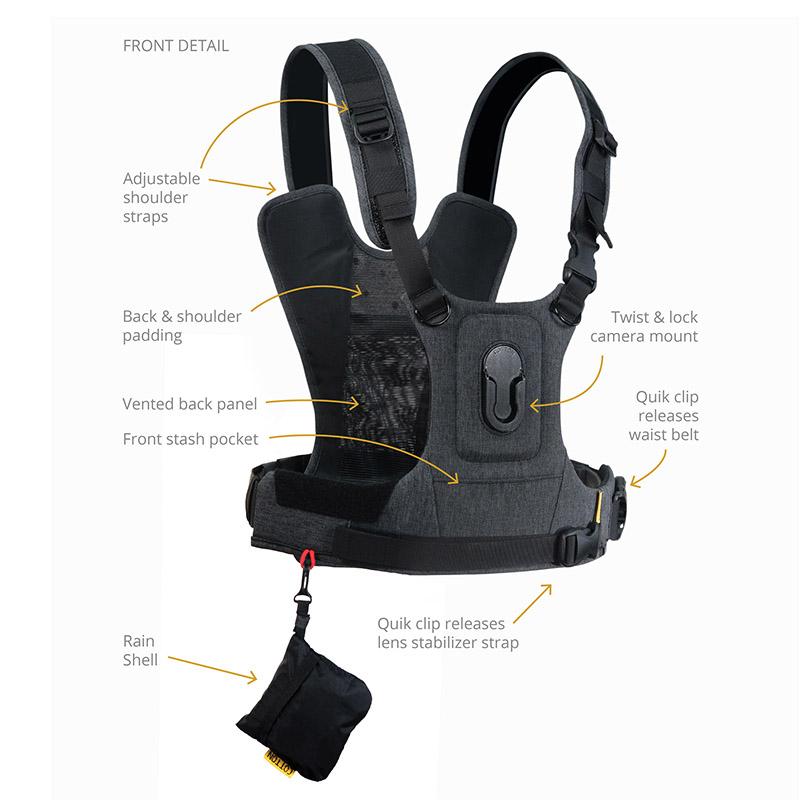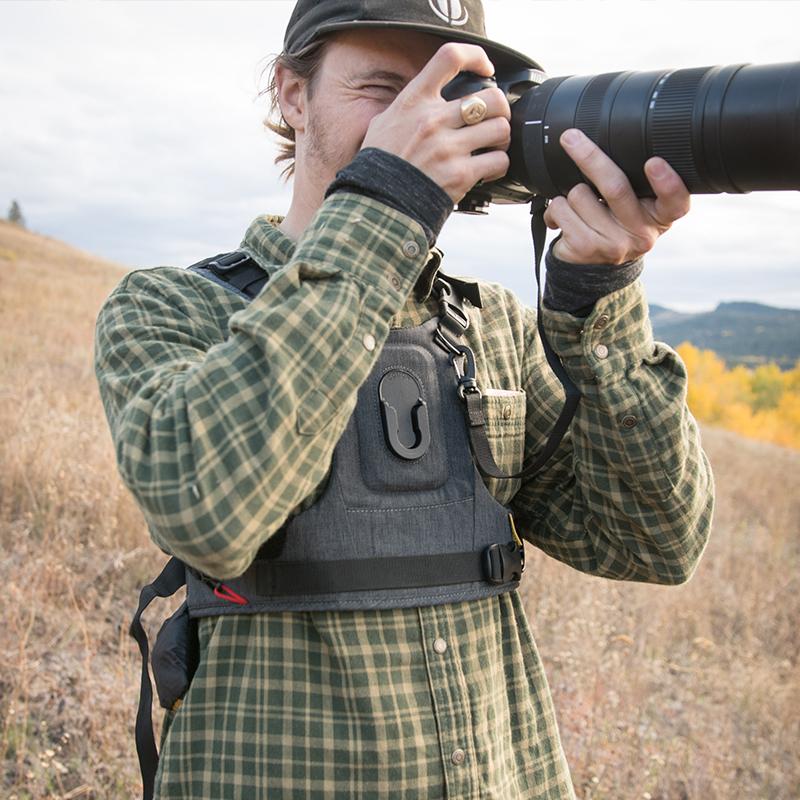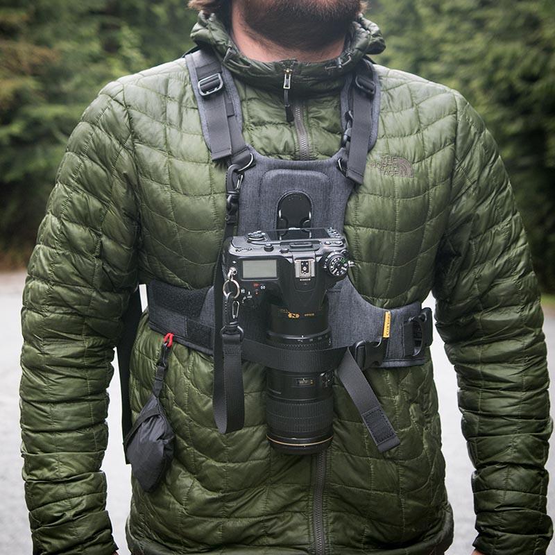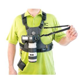 This system is designed for the active photographer. The harness supports and secures one camera with a long lens, keeping it always at the ready. The ergonomic design of this camera vest carrier distributes the weight of the camera helping to lessen the fatigue of a long shooting day. The Harness System is the ultimate in weight distribution, comfort and stability. We do not have a weight max that camera gear can reach.