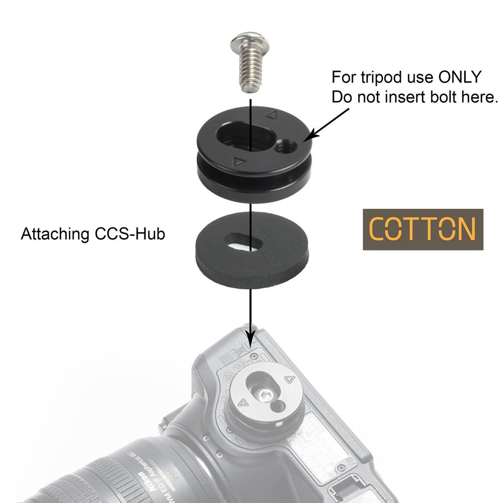 Cotton Carrier original, flat, virtually indestructible, friction-free, hard-anodized aluminum hub. Secured with a slotted hole to allow for slight adjustment to avoid blocking the battery door. A threaded hole on the hub allows you to still use your tripod with our system.